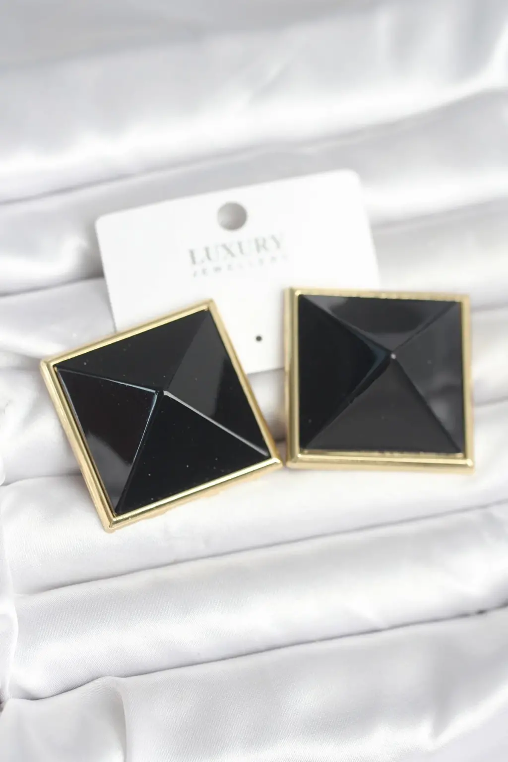 Pirinç Gold Renk Siyah Piramit Model Kadın Küpe, Gleam markasıyla sizin için özel olarak tasarlandı. Şık ve zarif görünümüyle her tarza uyum sağlayan bu çelik küpeler, hem günlük kullanım hem de özel günlerde tercih edebileceğiniz bir seçenektir.