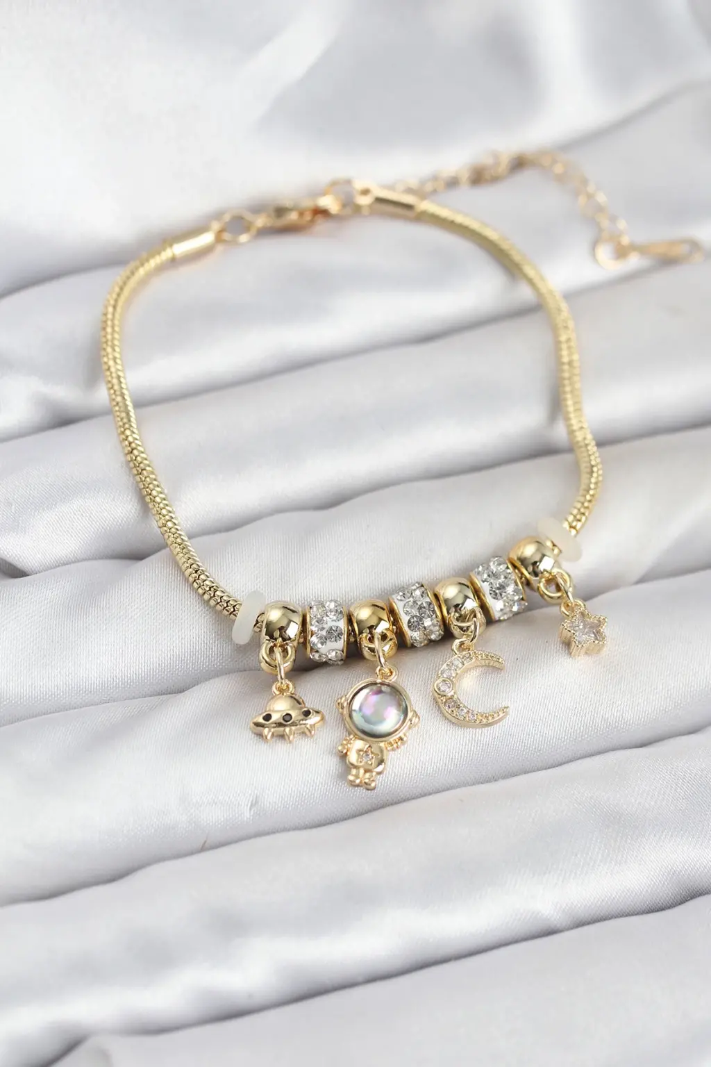 Çelik Gold Renk Uzay Tema Charmlı Kadın Bileklik Zarif detaylarla, göz alıcı tasarımlarla bezenmiş özel tasarım