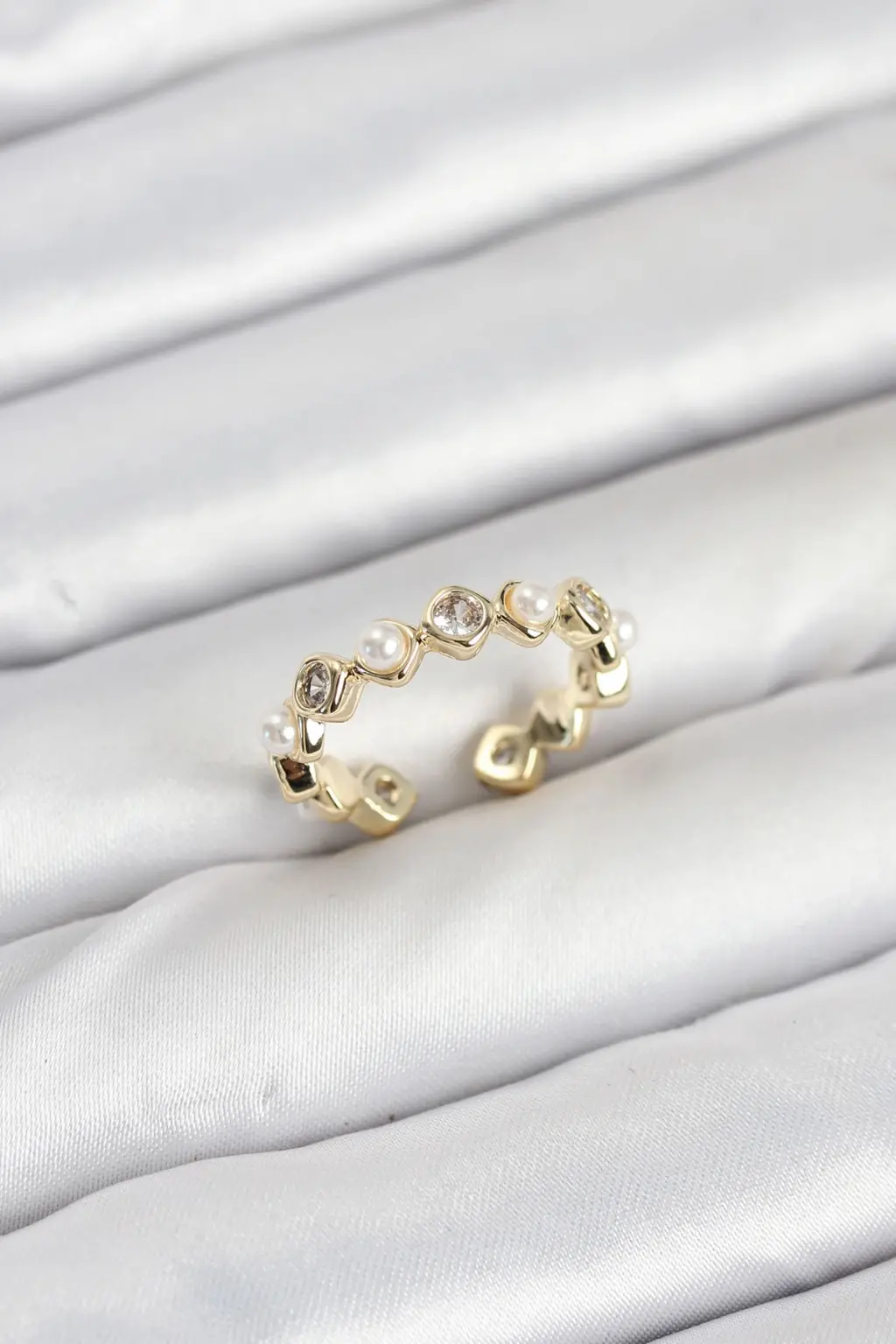 Gleam Pirinç Gold Renk Zirkon Taşlı İncili Kadın Yüzük ile tarzınızı tamamlayın, şıklığınızı ön plana çıkarın. Bu yüzüğü sevdiklerinize hediye ederek onları mutlu edebilirsiniz.