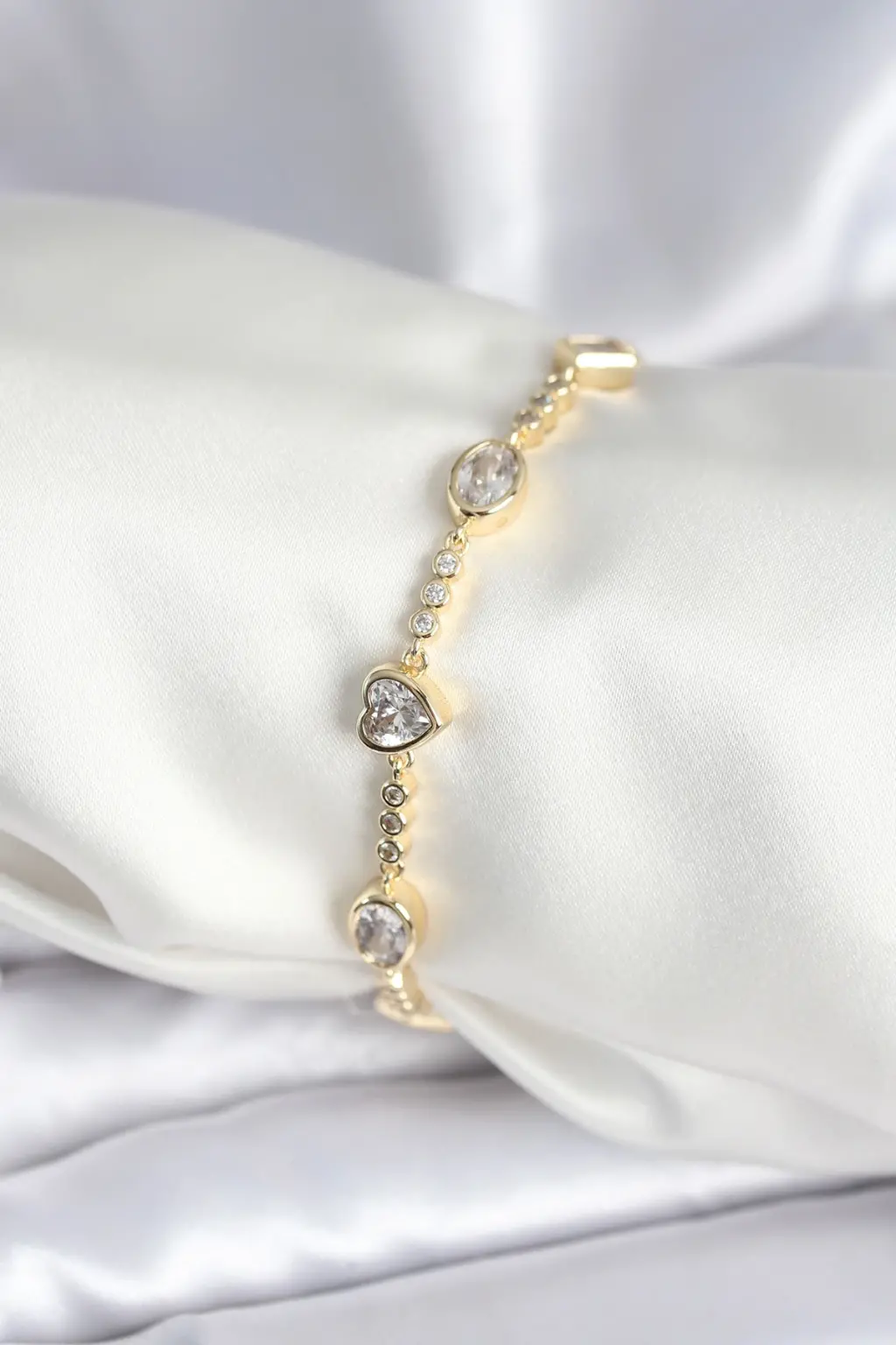 Pirinç Gold Renk Zirkon Taşlı Kalpli Model Kadın Bileklik Zarif detaylarla, göz alıcı tasarımlarla bezenmiş özel tasarım