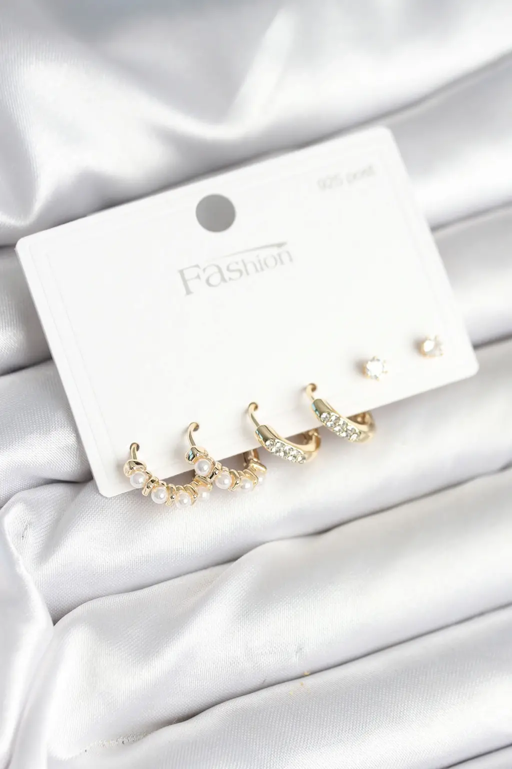 Pirinç Gold Renk Zirkon Taşlı ve İncili Model 925 Ayar Gümüş Çivi Kadın Küpe Seti Zarif detaylarla, göz alıcı tasarımlarla bezenmiş özel tasarım