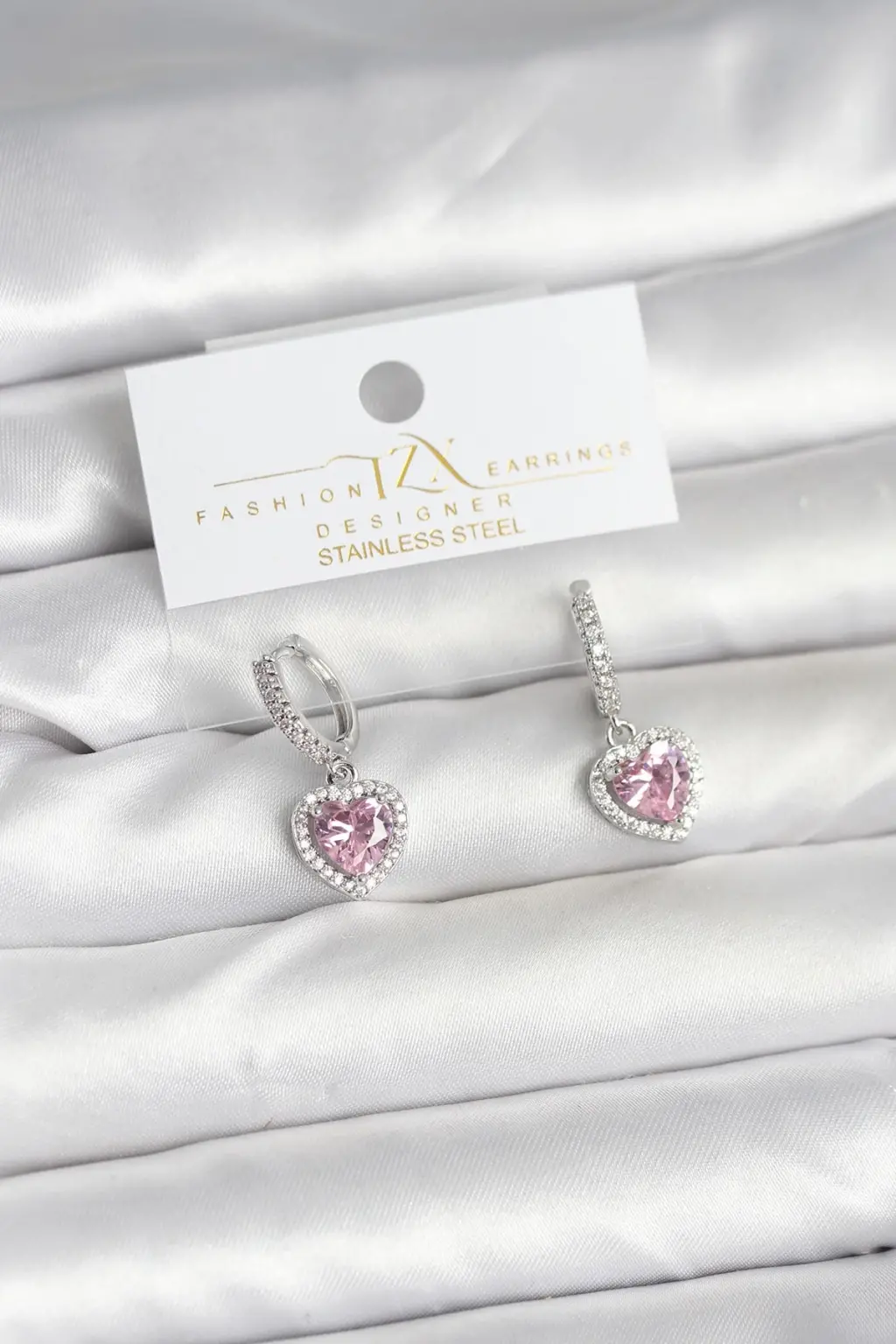 Pirinç Gümüş Pembe Renk Zirkon Taşlı Kalp Model Kadın Küpe, şıklığı ve zarafeti bir arada sunuyor.