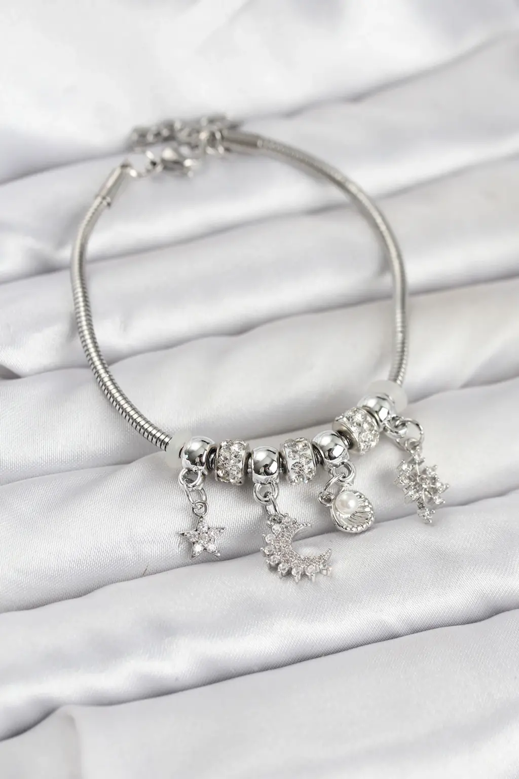 Çelik Gümüş Renk Ay Charm Model Charmlı Kadın Bileklik Zarif detaylarla, göz alıcı tasarımlarla bezenmiş özel tasarım