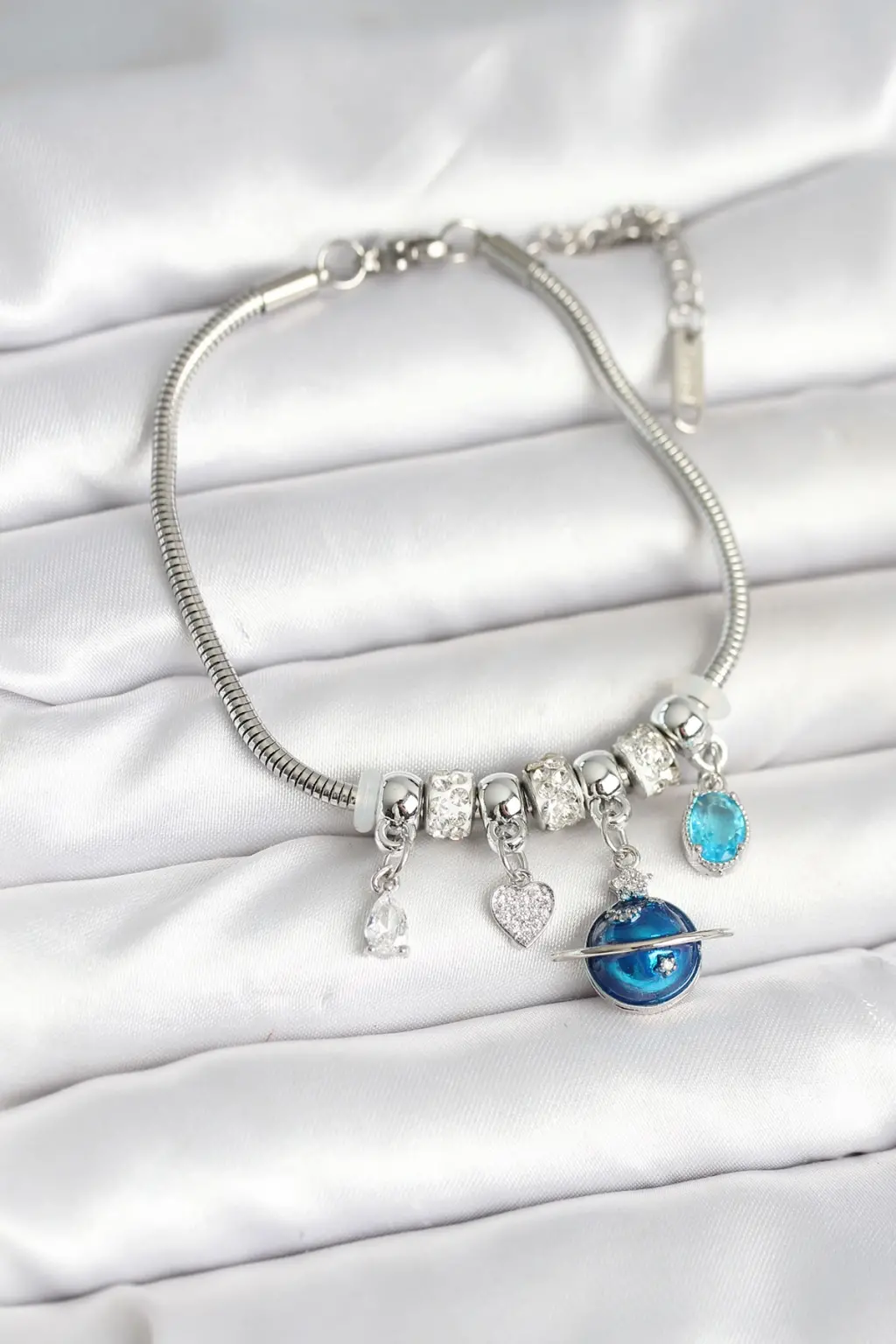 Pirinç Gümüş Renk Dünya Charmlı Kadın Bileklik Zarif detaylarla, göz alıcı tasarımlarla bezenmiş özel tasarım