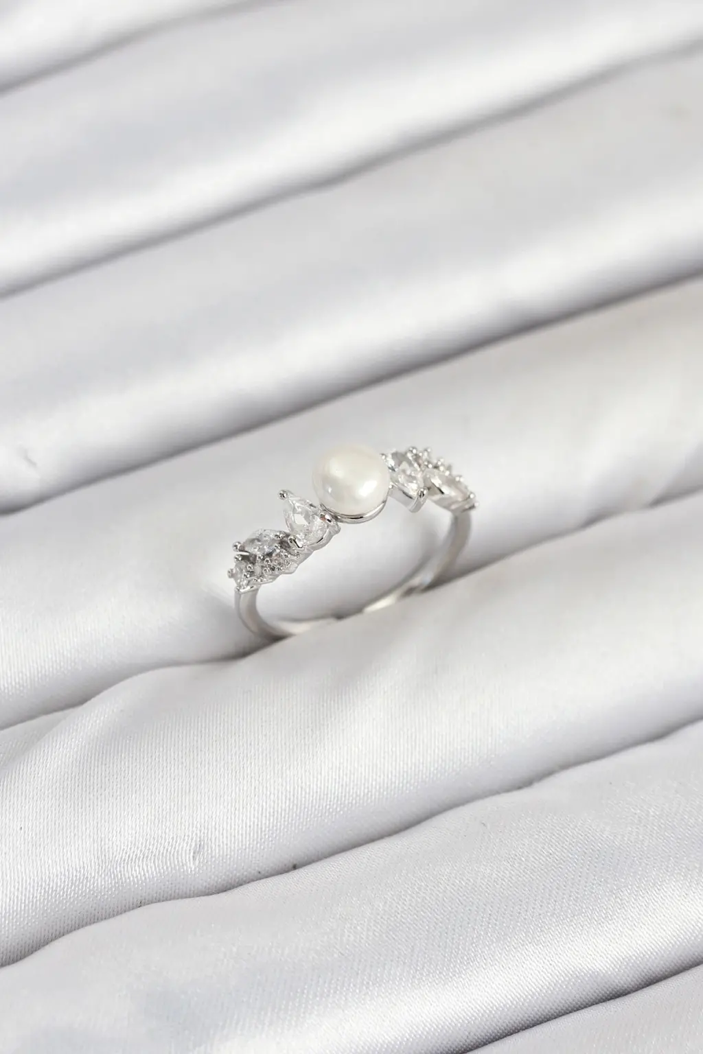 Zirkon taşlarıyla süslenen yüzük, her adımda dikkat çekmenizi sağlarken, inci detayı ise zarafetinizi ön plana çıkaracak.