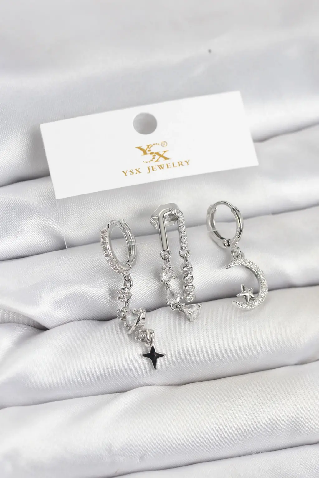 Çelik Gümüş Renk Zirkon Taşlı Uzay Model YSX Trio Küpe Seti Zarif detaylarla, göz alıcı tasarımlarla bezenmiş özel tasarım