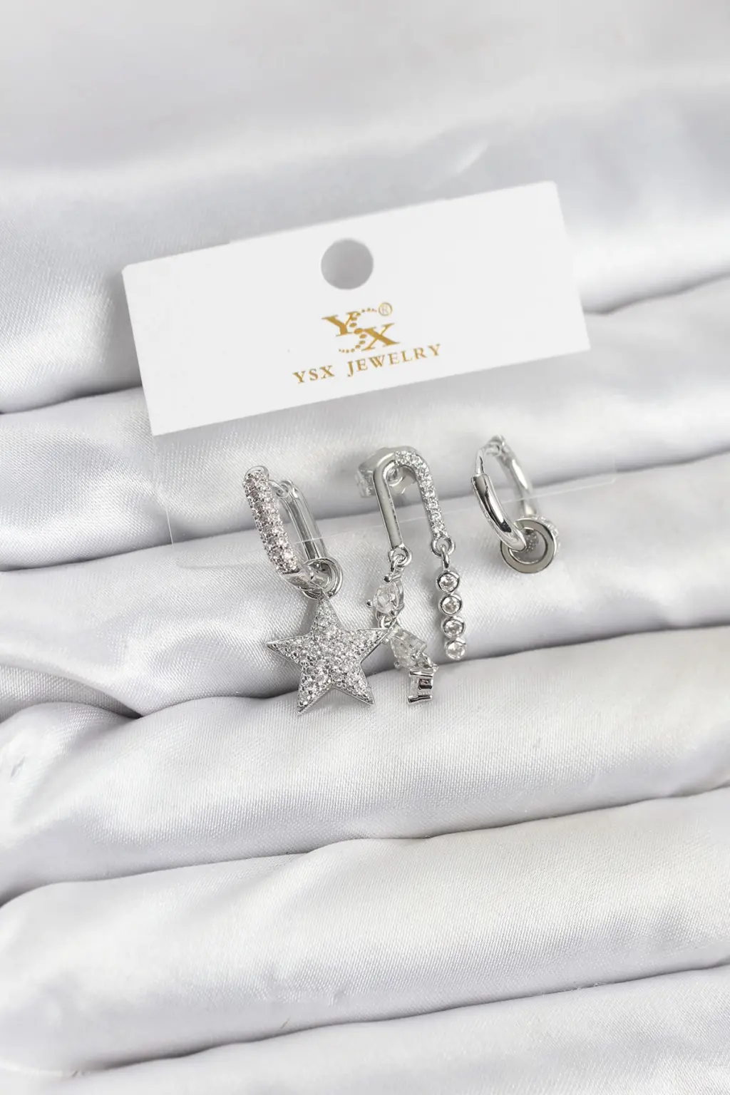 Çelik Gümüş Renk Zirkon Taşlı Yıldız Vintage Model YSX Trio Küpe Seti özel tasarım