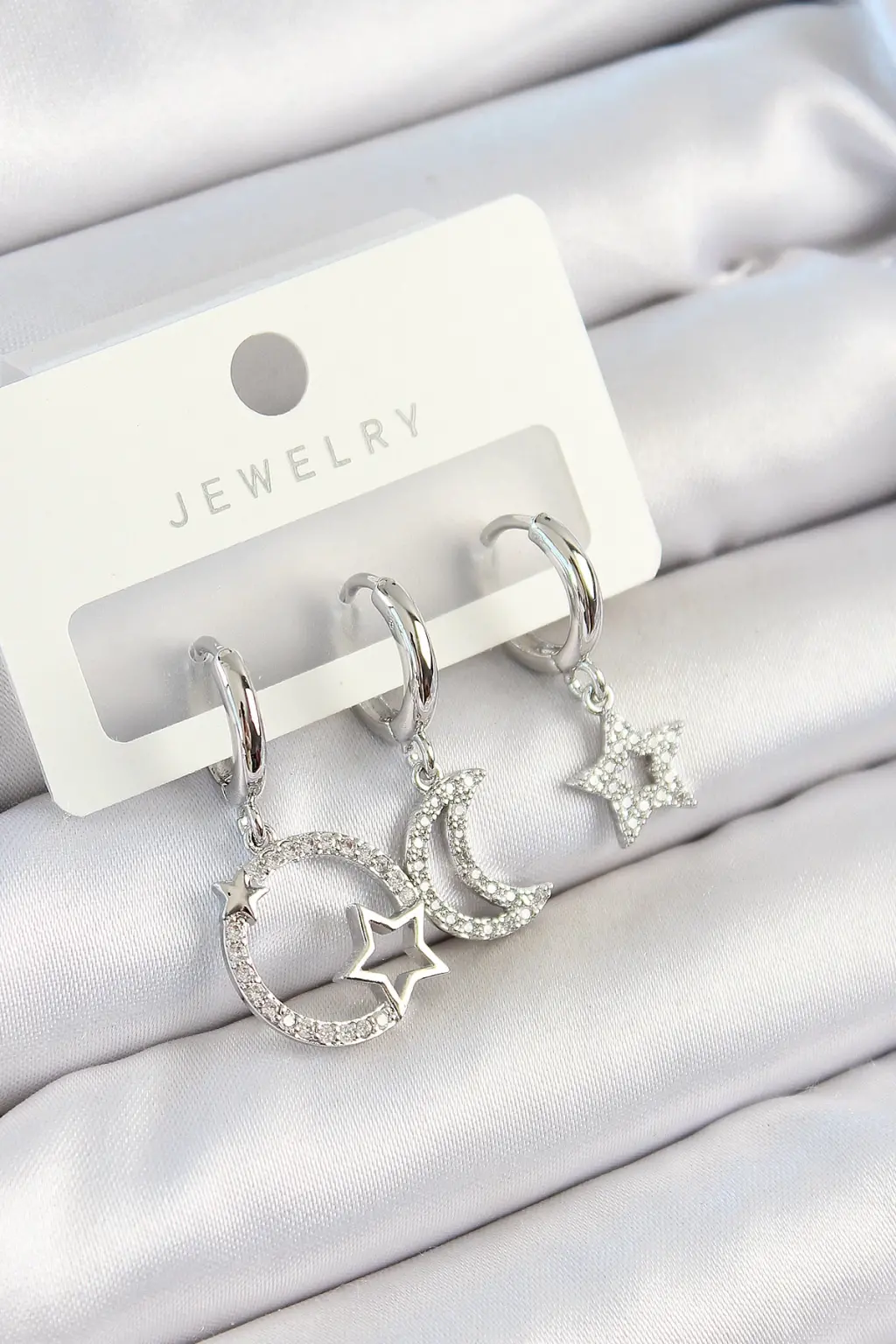 Pirinç Zirkon Taşlı Ay Ve Yıldız Model Gümüş Renk 3'lü Çift Kadın Küpe Set Zarif detaylarla, göz alıcı tasarımlarla bezenmiş özel tasarım