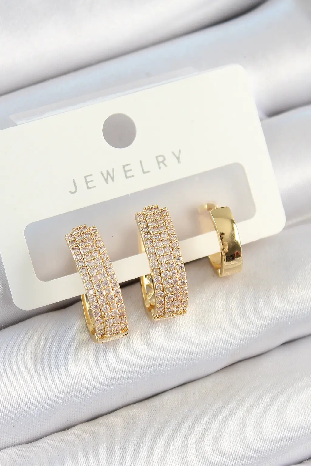 Pirinç Zirkon Taşlı Damla Model Gold Renk 3'lü Çift Kadın Küpe Set özel tasarım