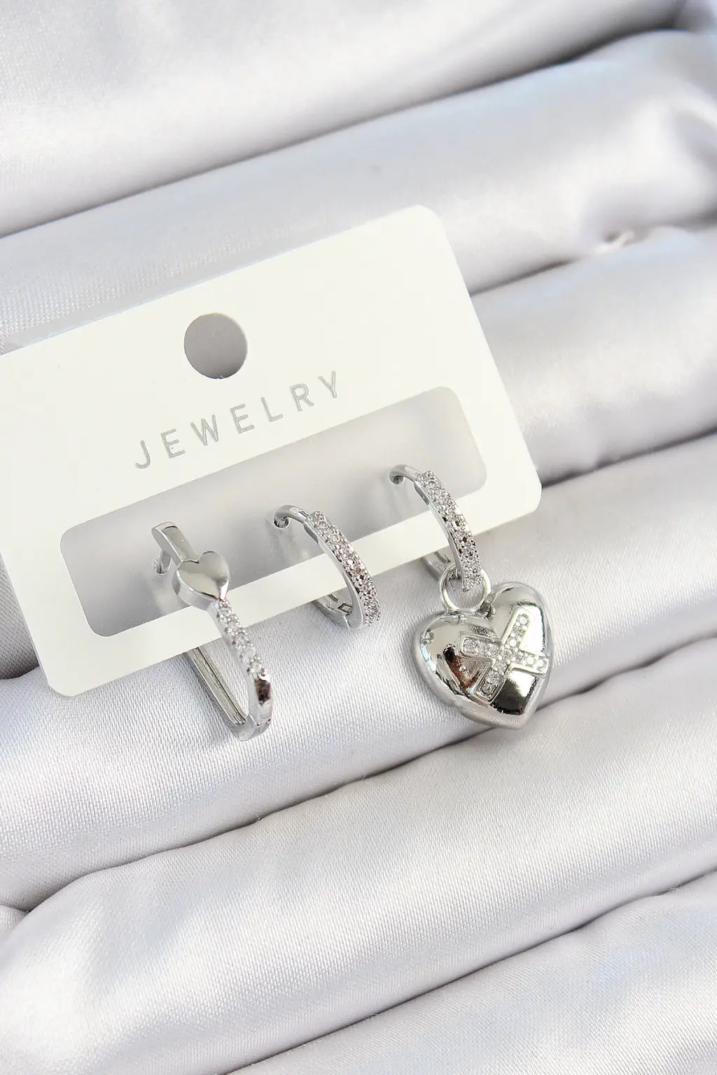Pirinç Zirkon Taşlı Kalp Model Gümüş Renk 3'lü Çift Kadın Küpe Set Zarif detaylarla, göz alıcı tasarımlarla bezenmiş özel tasarım