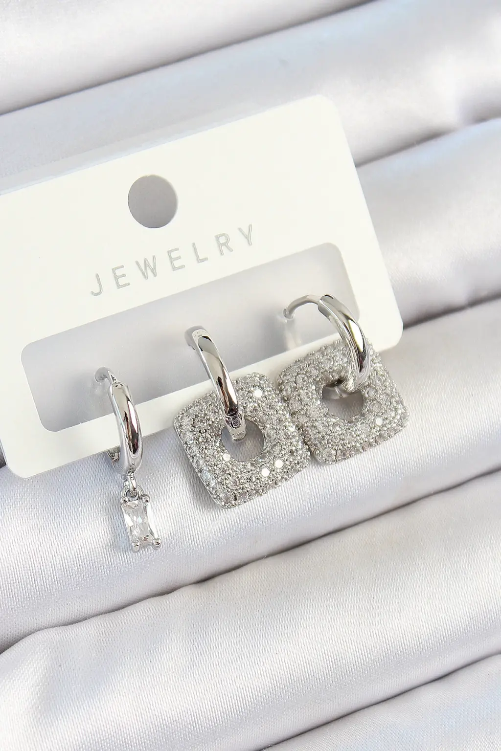 Pirinç Zirkon Taşlı Kare Model Gümüş Renk 3'lü Çift Kadın Küpe Set Zarif detaylarla, göz alıcı tasarımlarla bezenmiş özel tasarım