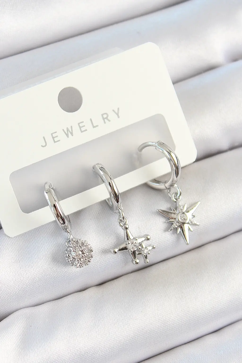 Pirinç Zirkon Taşlı Kutup Yıldızı Model Gümüş Renk 3'lü Çift Kadın Küpe Set Zarif detaylarla, göz alıcı tasarımlarla bezenmiş özel tasarım