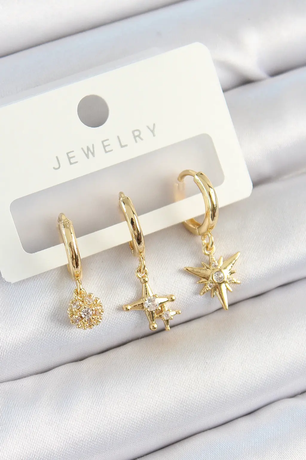 Pirinç Zirkon Taşlı Yıldız Model Gold Renk 3'lü Çift Kadın Küpe Set