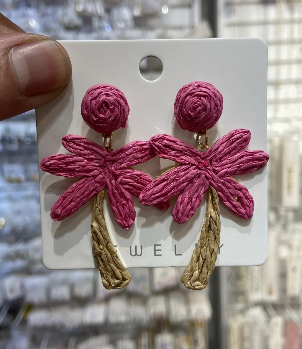 Gleam marka yazlık renkli hasır küpe ile stilinizi tamamlayın. Koyu pembe palmiye ağacı modeli, yaz aylarında şıklığınızı tamamlayacak harika bir seçenektir.