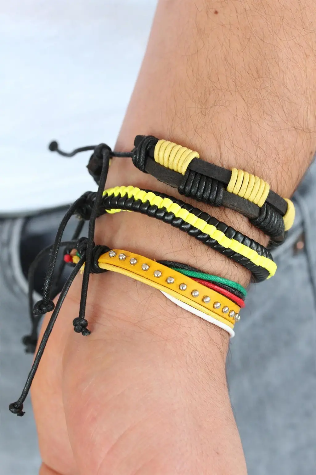 Sarı Renk Zımbalı Deri Erkek Bileklik Kombini Eşşiz tasarımıyla sizlerle. En uygun fiyat garantili kararmaz modelimiz karşınızda.
