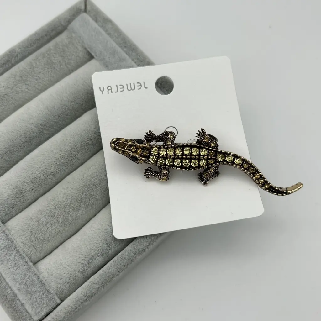 Bu şık broş, tarzınıza zarif bir dokunuş katacak. Siyah renkteki timsah figürü ile dikkat çeken bu broş, göz alıcı sarı taşlarla süslenmiştir. Hem günlük kullanıma hem de özel davetlere uygun olan bu broş ile farkınızı ortaya koyabilirsiniz.