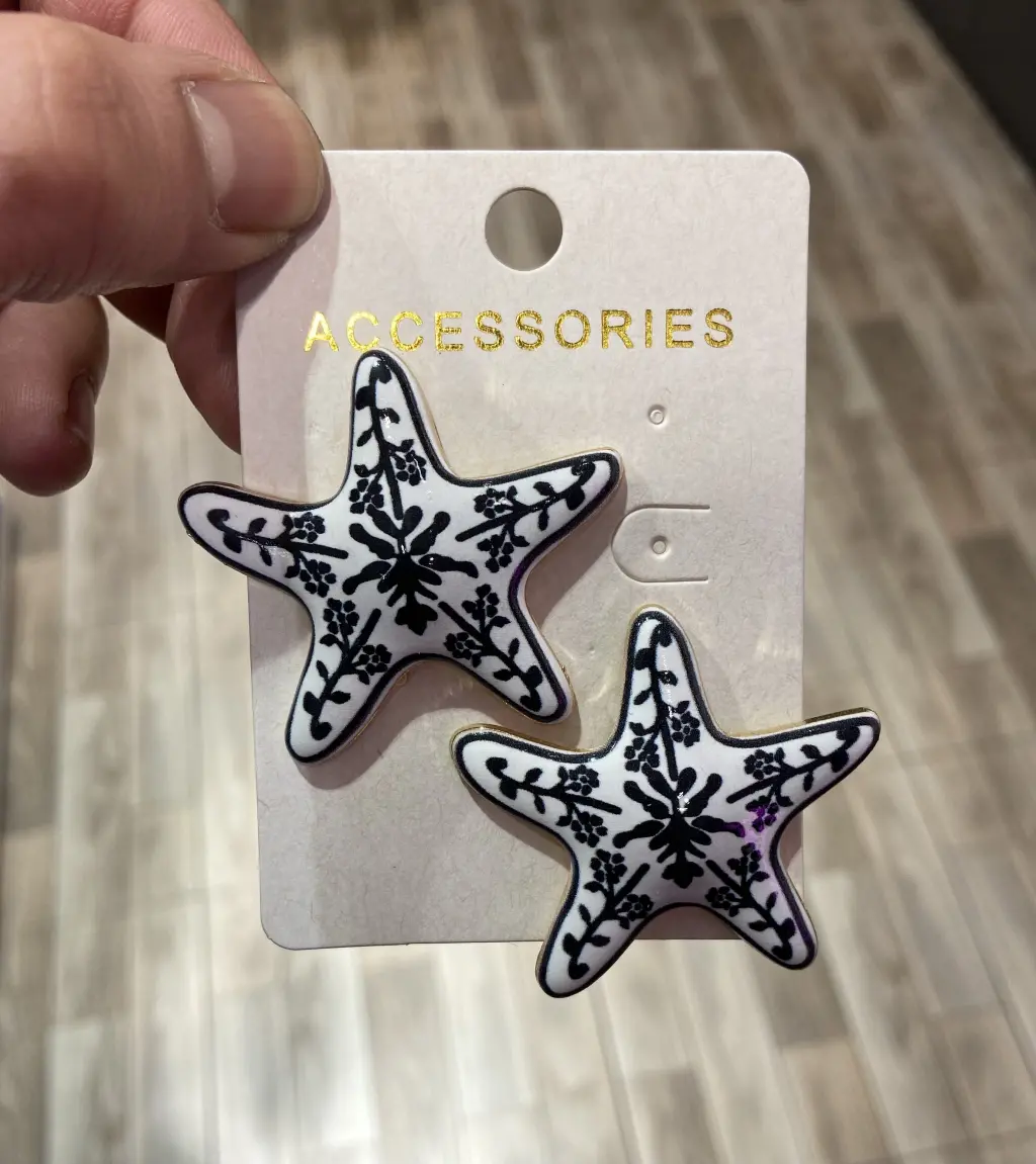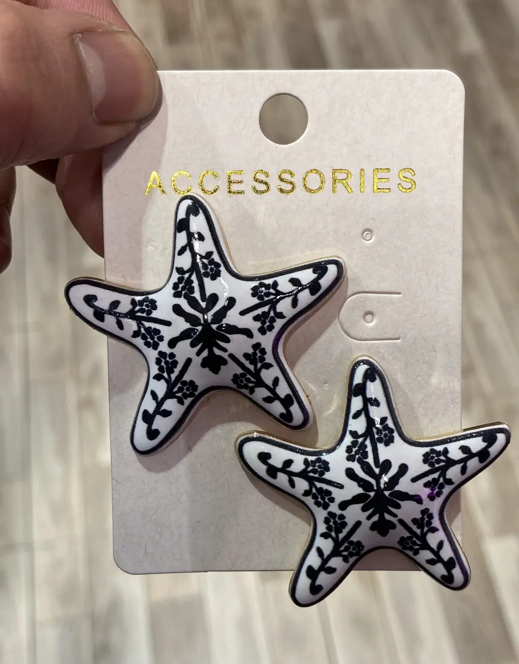Birbirinden şık ve göz alıcı bir görünüme sahip Siyah Desenli Mineli Renkli Deniz Yıldızlı Küpe, kombinlerinizi tamamlamak için harika bir seçenektir.