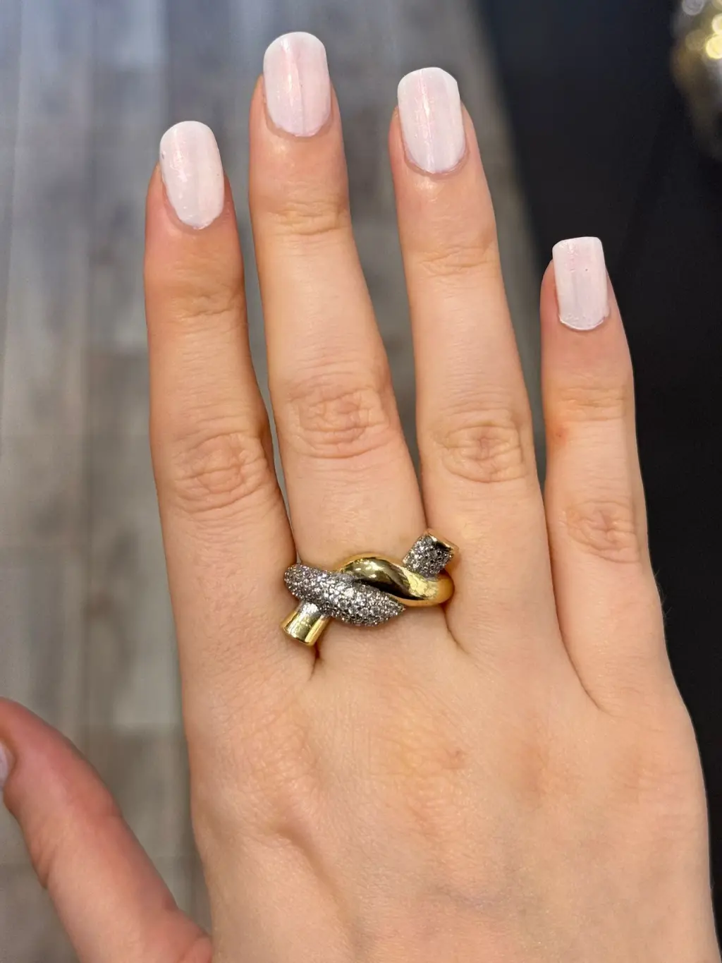 Zarif detaylarıyla dikkat çeken bu yüzük, altın ve gümüş tonlarının uyumunu modern bir sarmal formda buluşturur. Parlak taş süslemeleriyle ışığı her açıdan yansıtan tasarım, şıklığı ve zarafeti bir arada sunar.