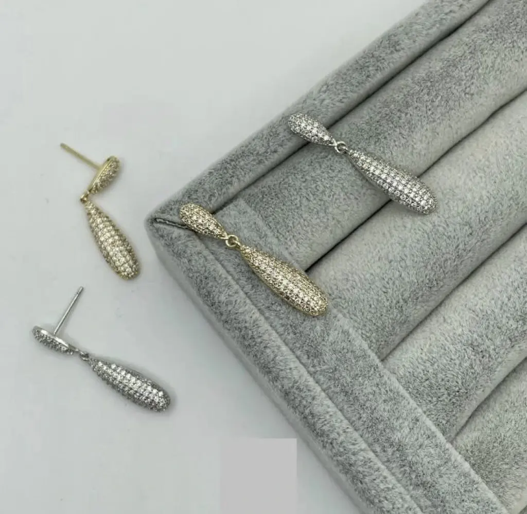 Zarif ve kadınsı çizgileriyle dikkat çeken Taşlı Uzun Damla Sallantılı Abiye Küpe, şıklığını ince detaylarla tamamlamak isteyenler için tasarlanmış göz alıcı bir modeldir. Damla formundaki dizaynı, yüzü daha ince ve uzun gösteren doğal bir etkiye sahiptir. Üzerini tamamen kaplayan mikro zirkon taşlar, küpenin her hareketle ışığı yakalamasını sağlayarak yoğun bir ışıltı sunar. İnce ama iddialı duruşuyla hem zarif hem de güçlü bir stil oluşturur.