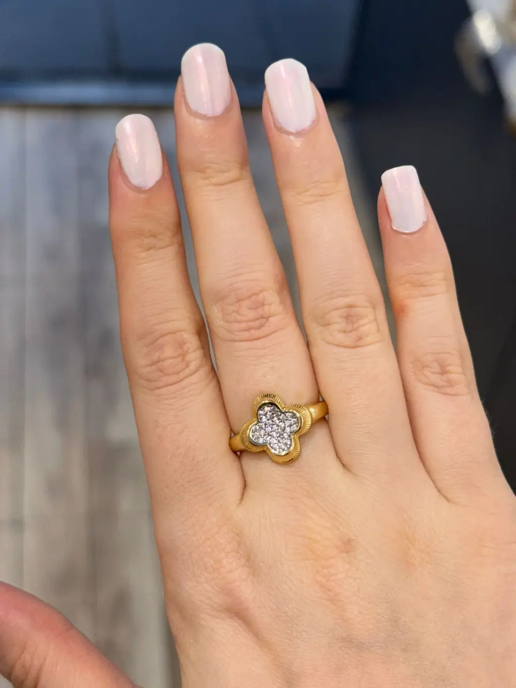 Klasik zarafetiyle öne çıkan bu kadın çelik yüzük, ortasında yer alan taşlı yonca figürüyle şansın ve zarafetin sembolünü parmaklara taşır. Dört yapraklı yonca motifi, parlak taşlarla süslenerek ışığı her açıdan zarif bir şekilde yansıtır. Altın tonun sıcak parıltısı, taşların ışıltısıyla birleşerek feminen ve sofistike bir görünüm yaratır.