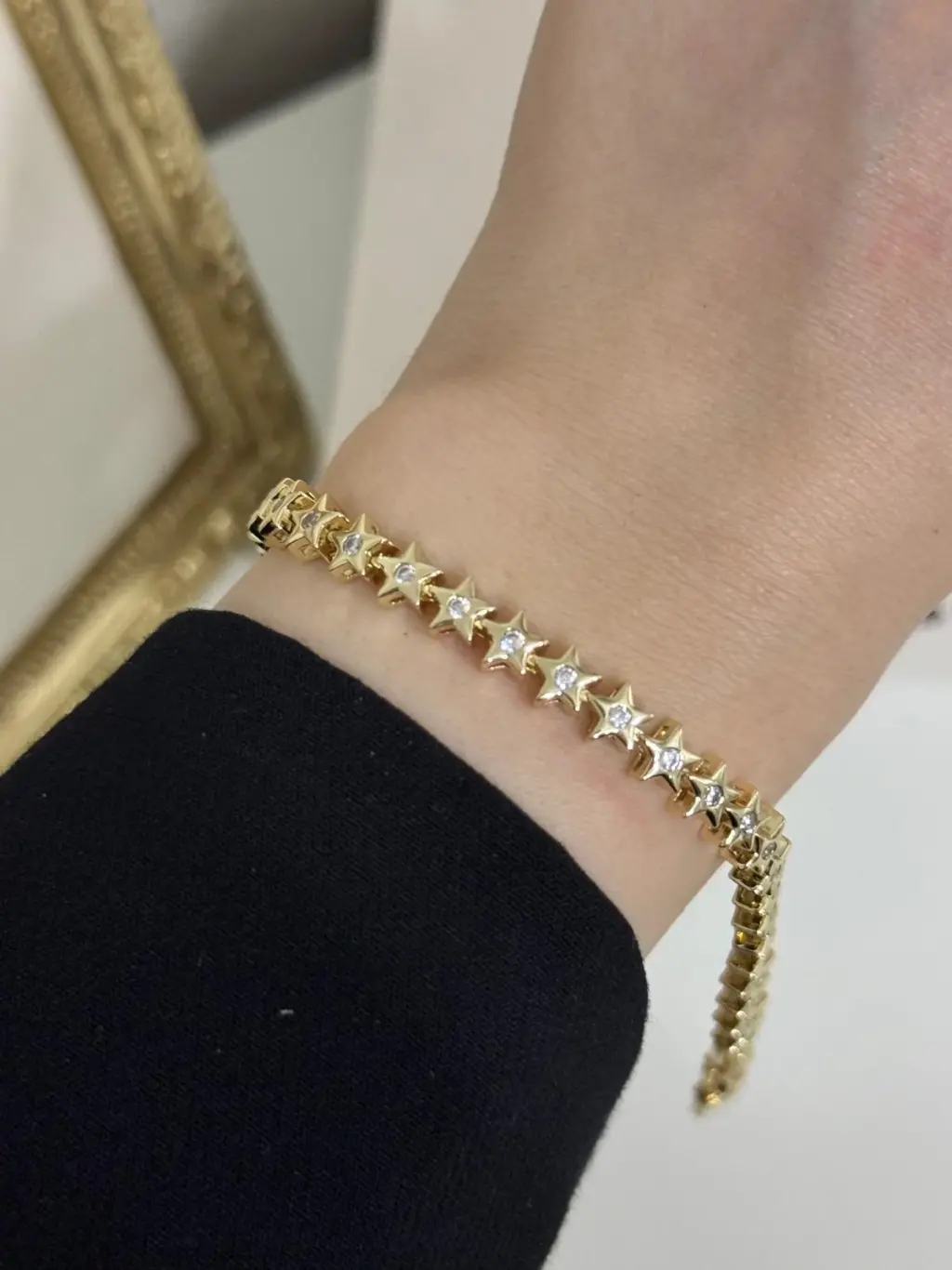 Yüksek kaliteli 14K altın renkli gümüş kaplama ile üretilen YSX Bileklik, dayanıklı yapısı sayesinde uzun süre ilk günkü parlaklığını koruyor. Zarif yıldız detayları ile dikkat çeken bu bileklik, her yaş ve tarza hitap ediyor.