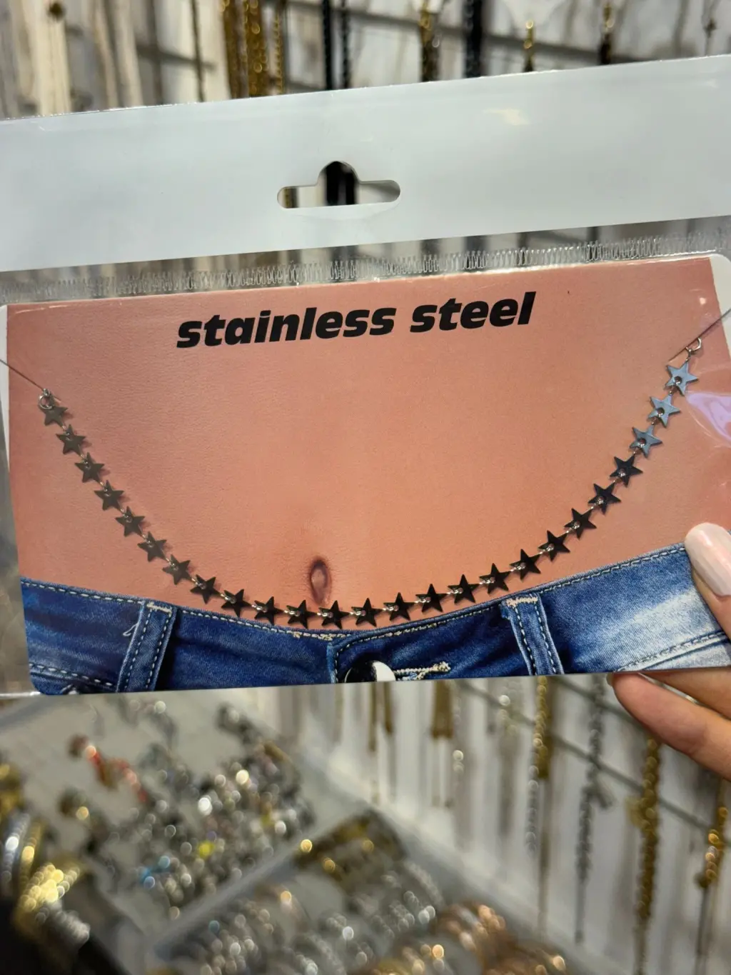 Işıltılı yıldız figürleriyle dikkat çeken bu zarif göbek zinciri, gökyüzünün enerjisini tarzına yansıtmak isteyenler için tasarlandı. Paslanmaz çelikten üretilen zincir, suya ve terlemeye dayanıklı yapısıyla uzun süre parlaklığını korur. Yıldız detaylarının vücudu saran dizilimi, feminen ve özgüvenli bir görünüm sunarken her kombinle kolayca uyum sağlar.