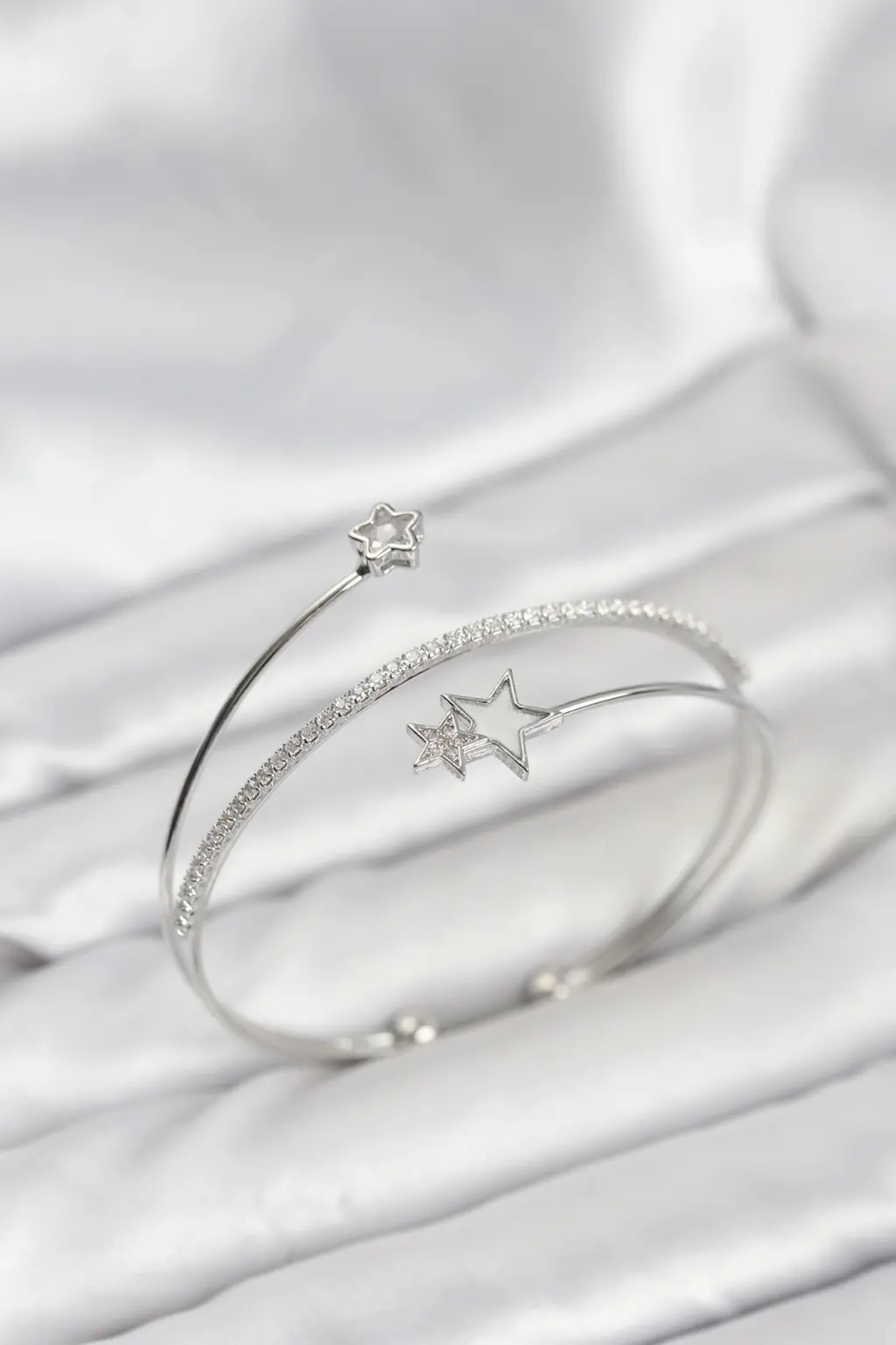 Bu göz alıcı bileklik, yıldız desenli tasarımı ile dikkat çeker ve her kombini tamamlamak için ideal bir aksesuardır.