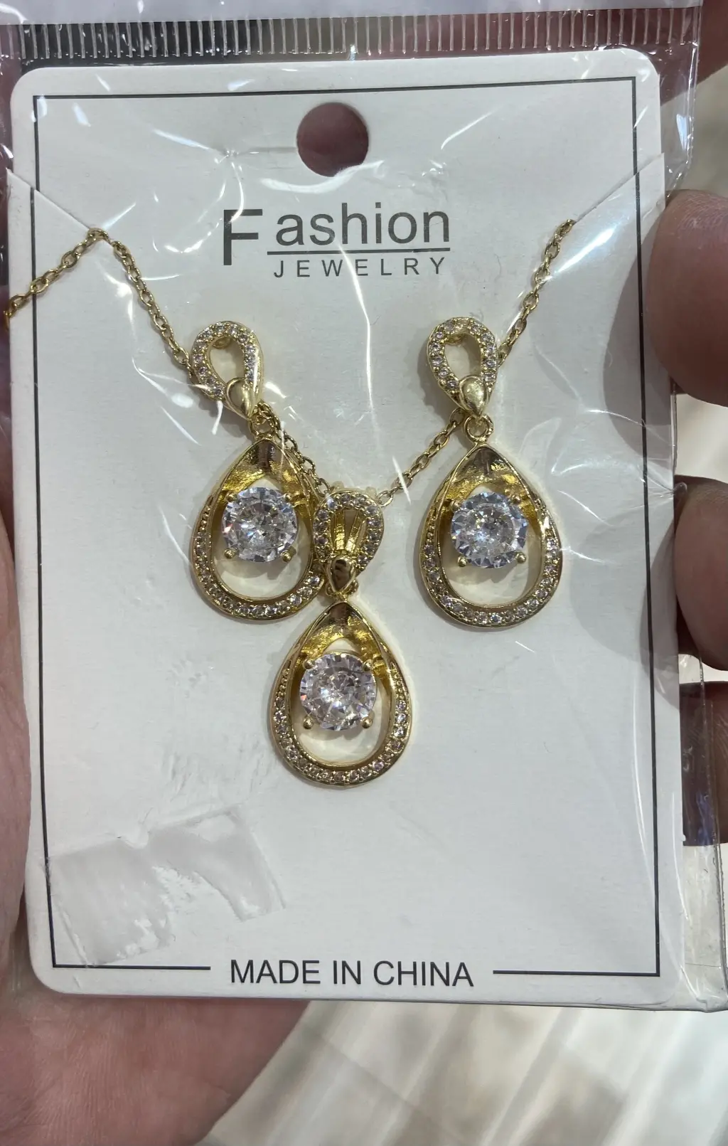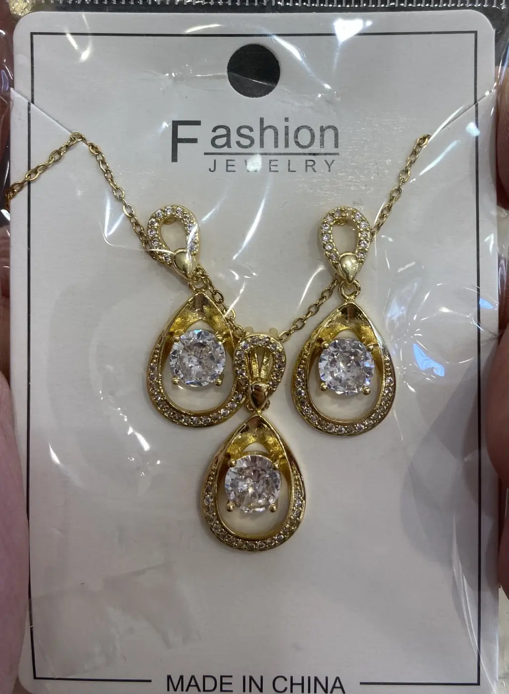 Yuvarlak Pırlanta Görünümlü Damla Gözyaşı Model Altın Kaplama Kolye Küpe Takı Seti
